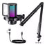 Micrófono Condensador USB, soporte de brazo, shock mount, filtro antipop, cable USB y USB C, abrazadera de escritorio, manual.